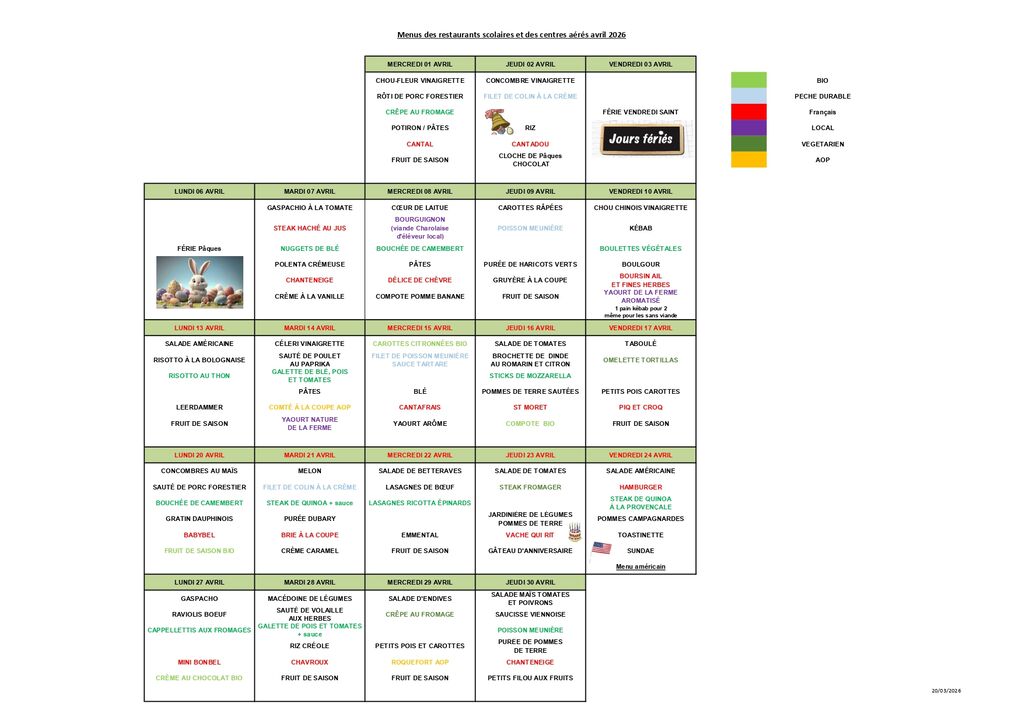Menus restauration périscolaire
